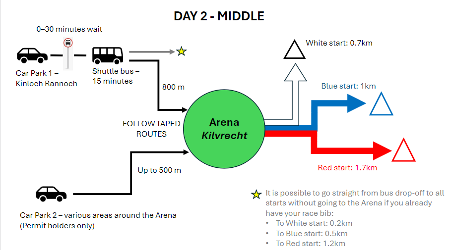 On Day 2 (Middle) it is possible to go straight to all starts from the bus drop-off point, without visiting the Arena, assuming you have your Bib.