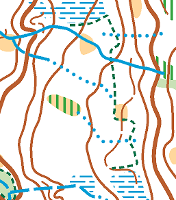 Vegetation boundaries are marked with the green dashed line symbol (not the black dotted line symbol). This can appear somewhat similar to the blue dotted linear marsh symbol in some areas. See picture for illustration.