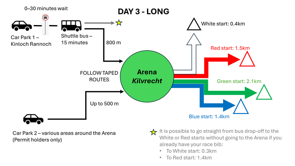 On Day 2 (Middle) it is possible to go straight to all starts from the bus drop-off point, without visiting the Arena, assuming you have your Bib.